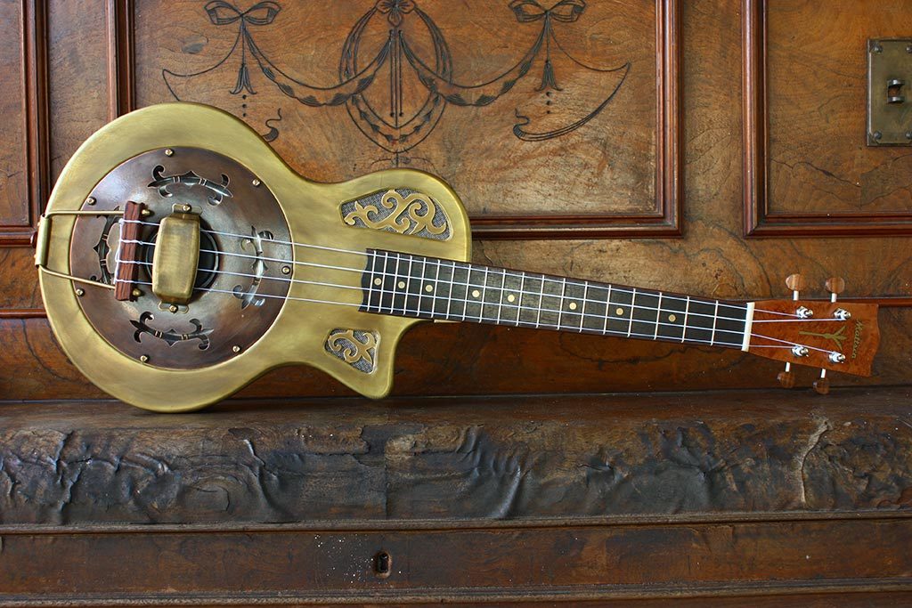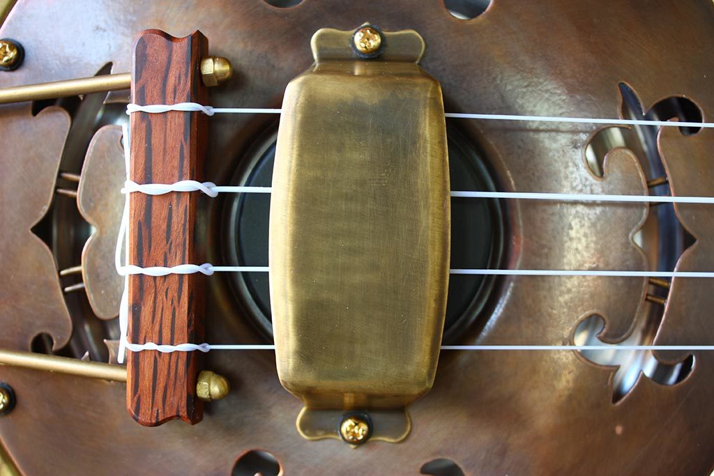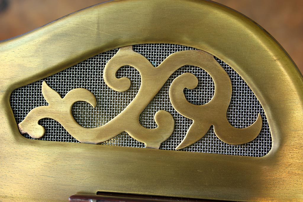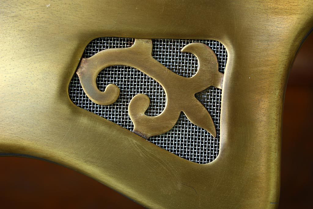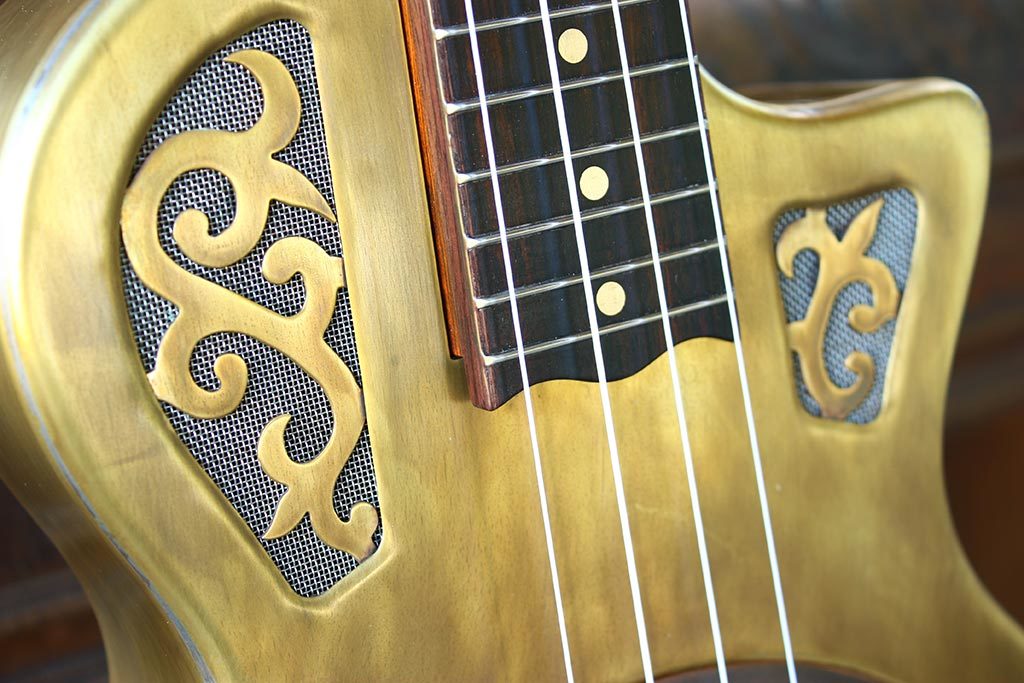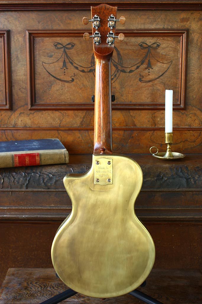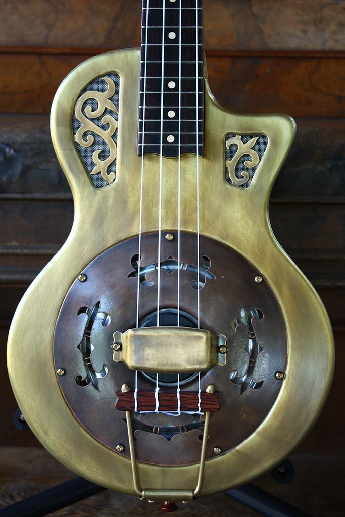 This Tenor Ukulele has an Antiqued finish on its Brass Body and Copper Cover plate. The body edge has been rolled to give a nice rounded, comfortable feel to this Ukulele. A feature really seen on other lesser instruments. All the sound holes have been hand cut by myself, with jewellers saws and the two top bout ones are backed with mesh.