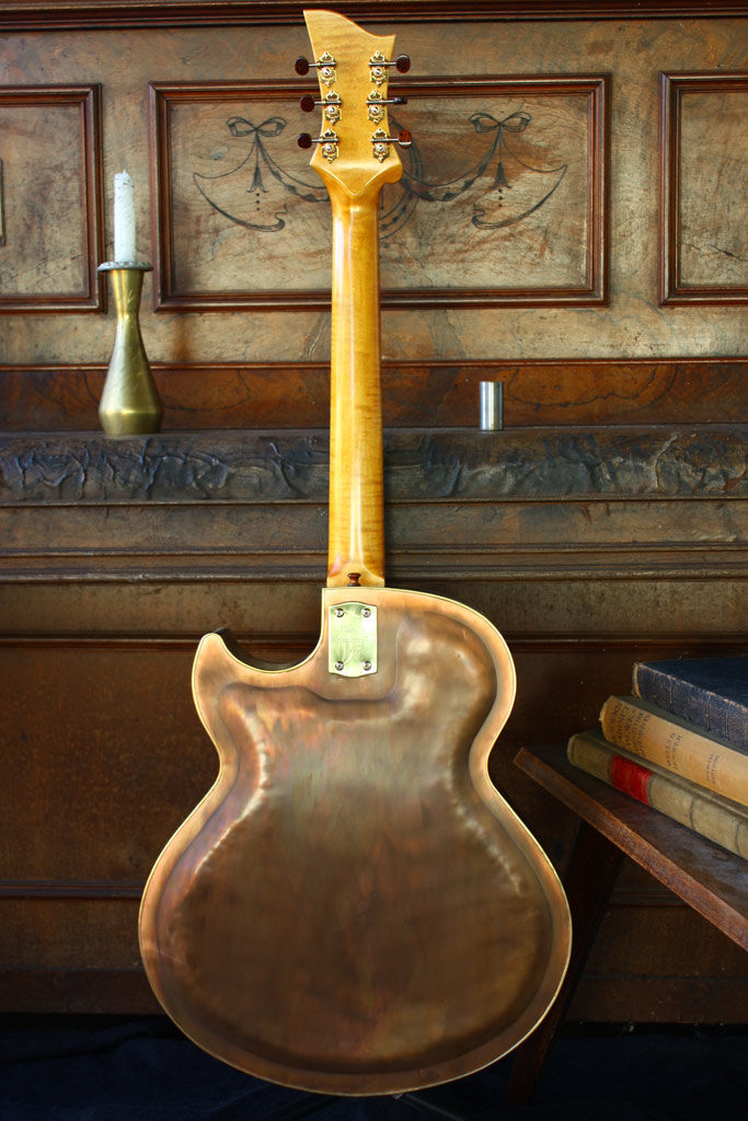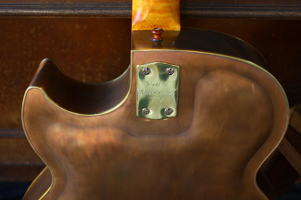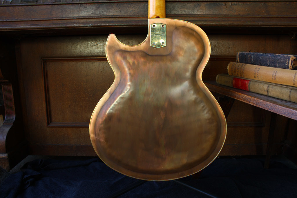 The styling of this guitar is designed to impress. With the Copper body bound with Brass binding; a process that takes many hours of work but adds so much to the beauty of this instrument.