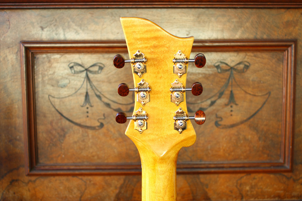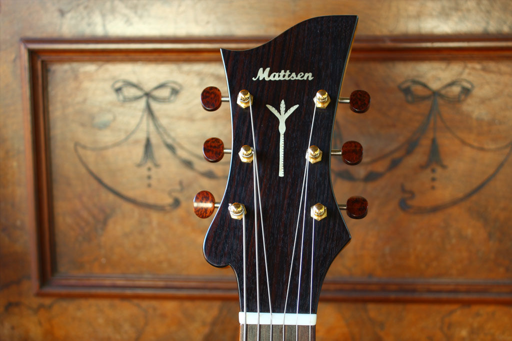 The neck is a work of art in itself. Hand carved from beautiful Curly Maple and veneered with Ebony, for a very strong neck. The Ebony fingerboard is bound for a smooth feel on your hands, and the flamboyant Asymmetrical Headstock has been inlayed with a hand cut Brass Mattsen logo.