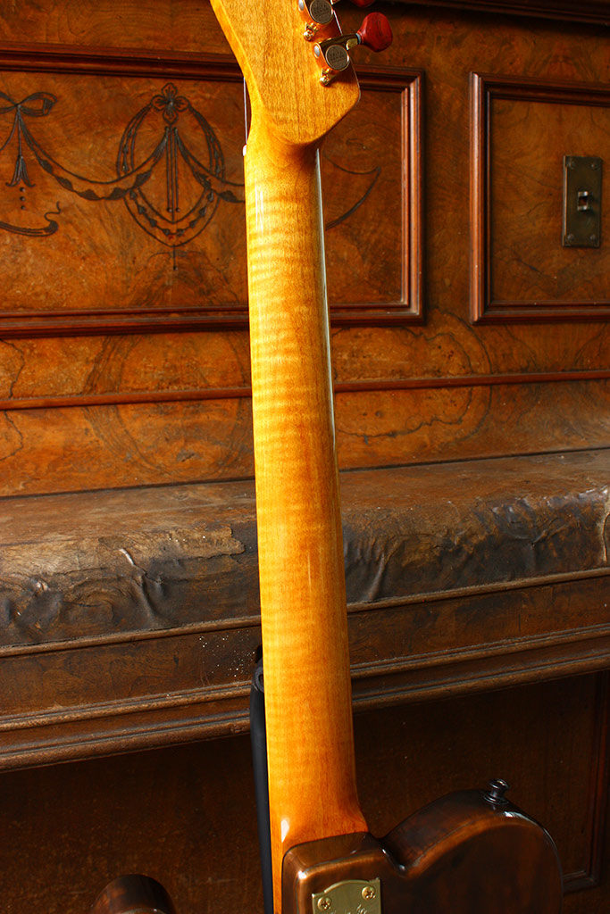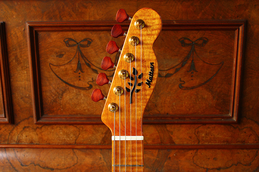 The Neck is made from Curly Maple, with the Snake Head Headstock featuring a raised Leaf and Mattsen motif to match the Body. Tuning is via the gorgeous Gotoh 510 Delta Series Machine Heads to which I’ve added wooden knobs as they lighten the neck for balance.