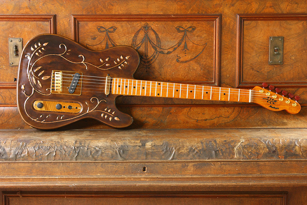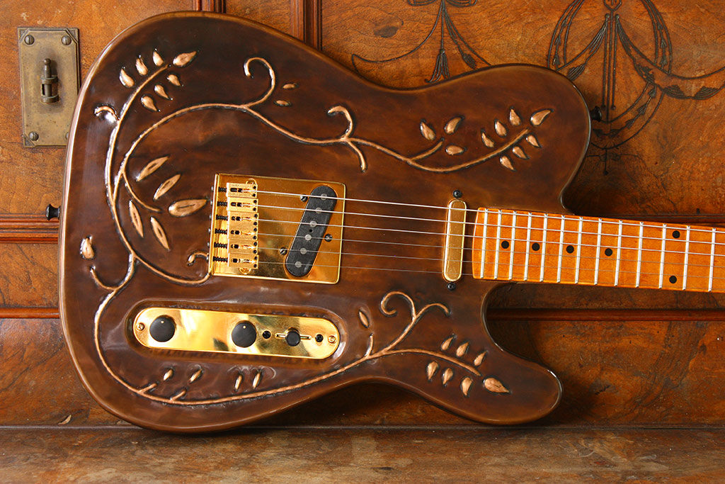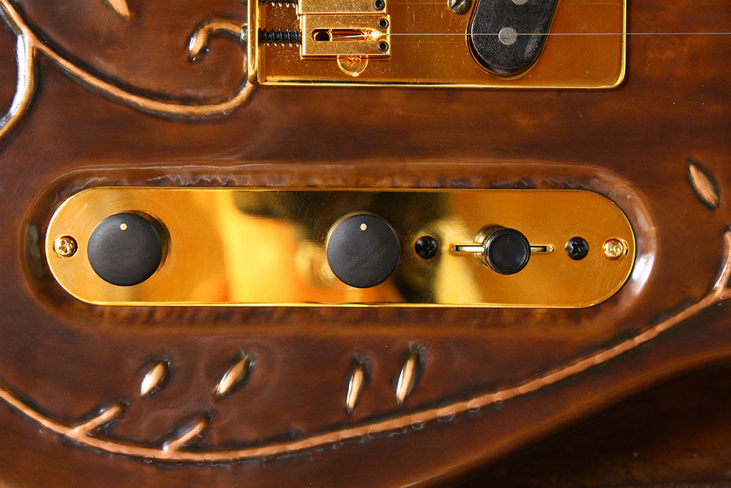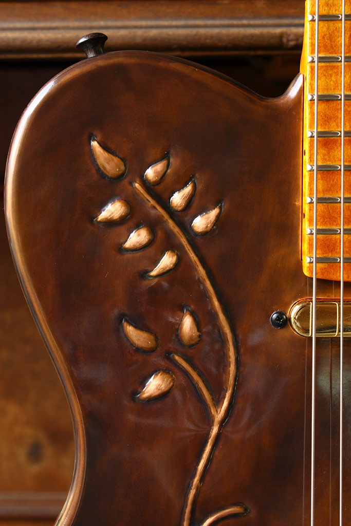 The Leaf and Vine design on the copper body of this guitar has been raised by an Old World technique called Chasing and Repousse. This is where you hammer the design by hand from the reverse side to raise the metal then hammer from the front to highlight the design. A time consuming art. Well worth the beauty and feel it gives in your hands. The body has been patinaed to a dark Brown then lacqued for protection.