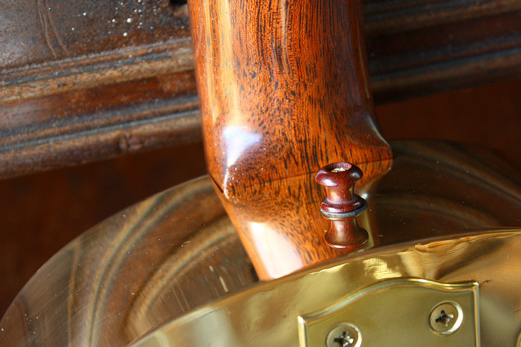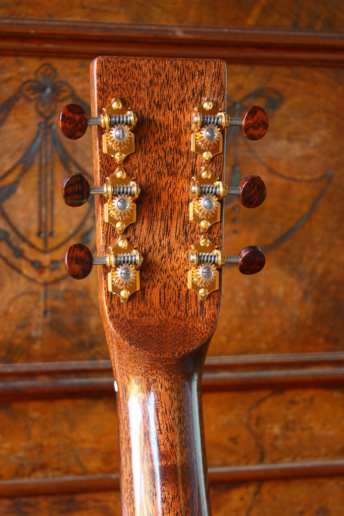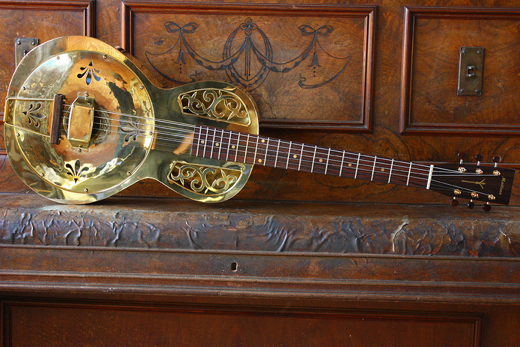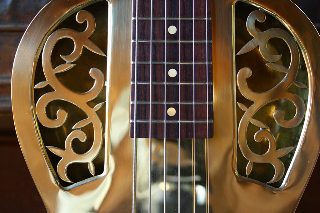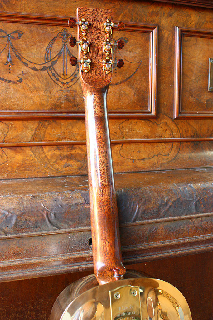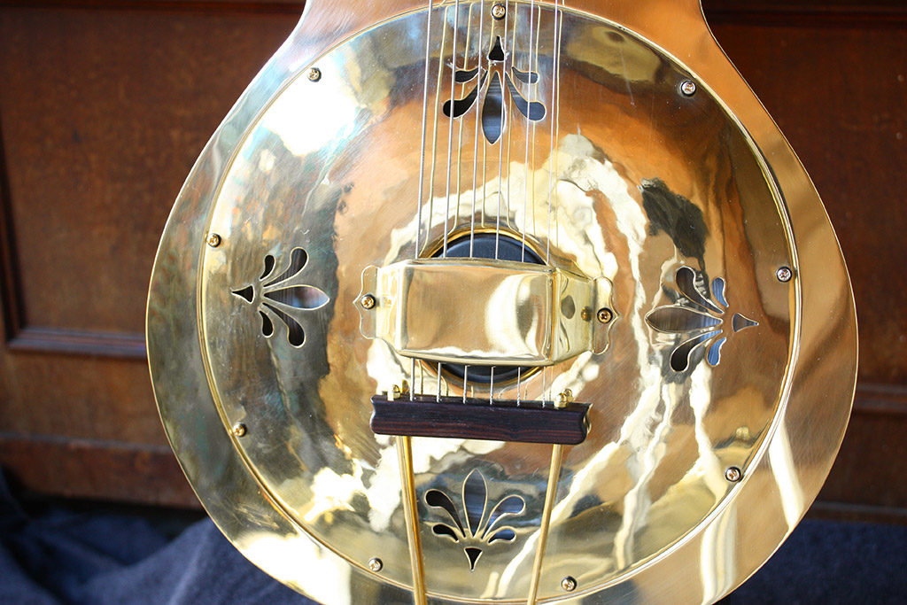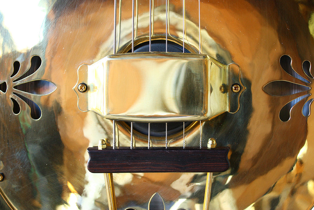 The large sound holes in the upper bout allowed the sound to ring out with a piano-like clearness that I have never come across before in a Resonator Guitar. When Philip commissioned his dream guitar for his upcoming retirement he asked, ” Can you you set it up for playing in open C as that’s the only key I can sing in. Lol ” So this guitar has been strung with 16-59 gauge strings and a low action to suit his style of playing.